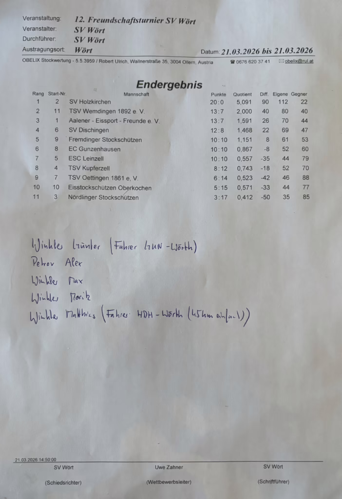 Für den EC Gunzenhausen gingen neben Alex Petrov noch vier Winkler (Günter, Matze, Max und Moritz) an den Start. Die Mannschaft konnte jedes zweite Spiel gewinnen und wurde letztendlich 6. unter den 11 startenden Teams. Als Fanclub waren Oma und Michel Winkler mitangereist.